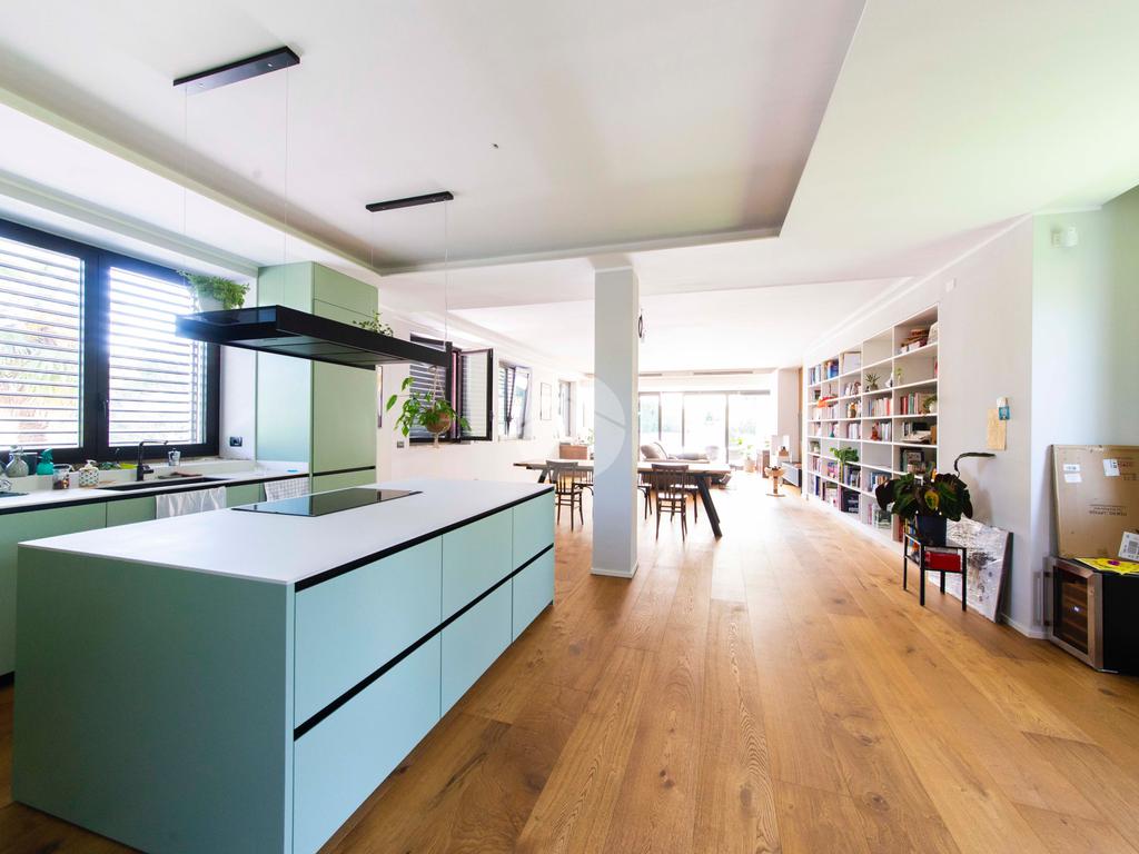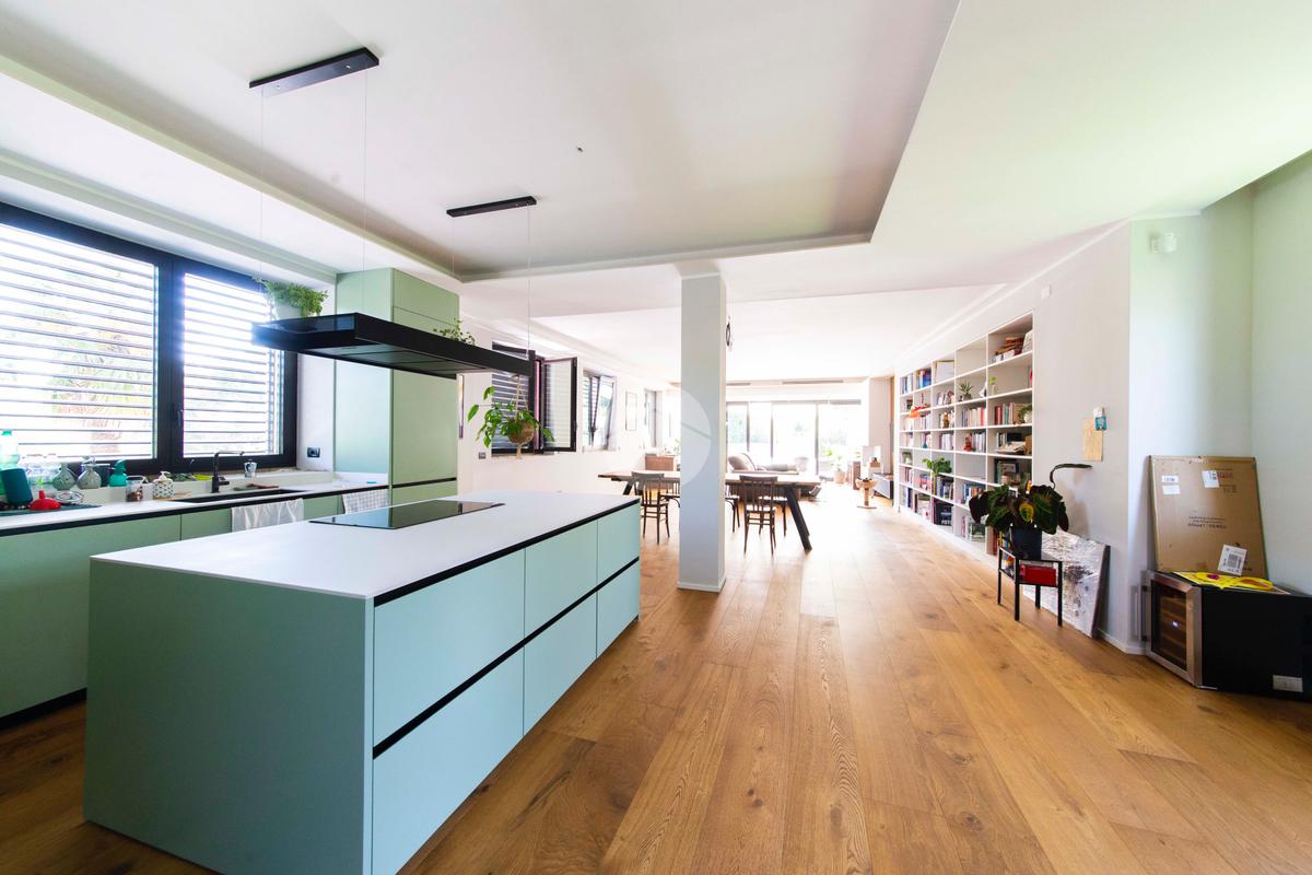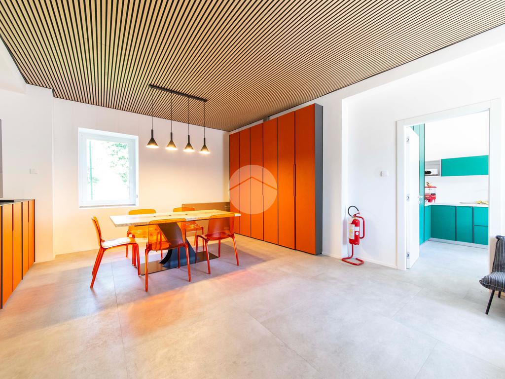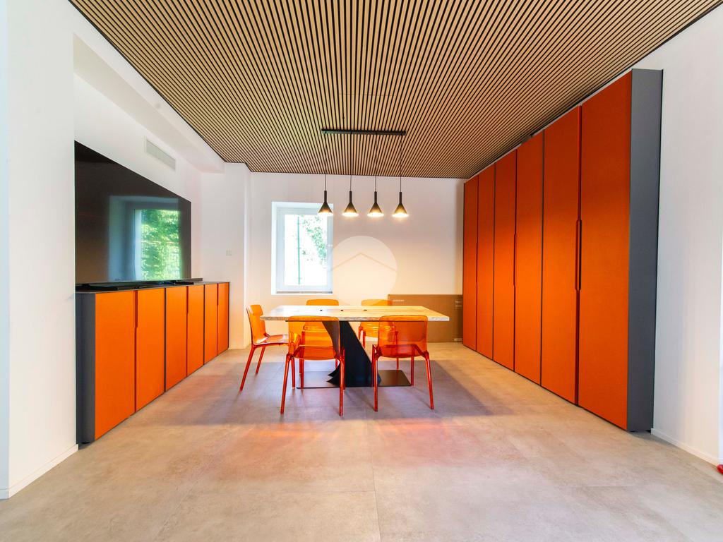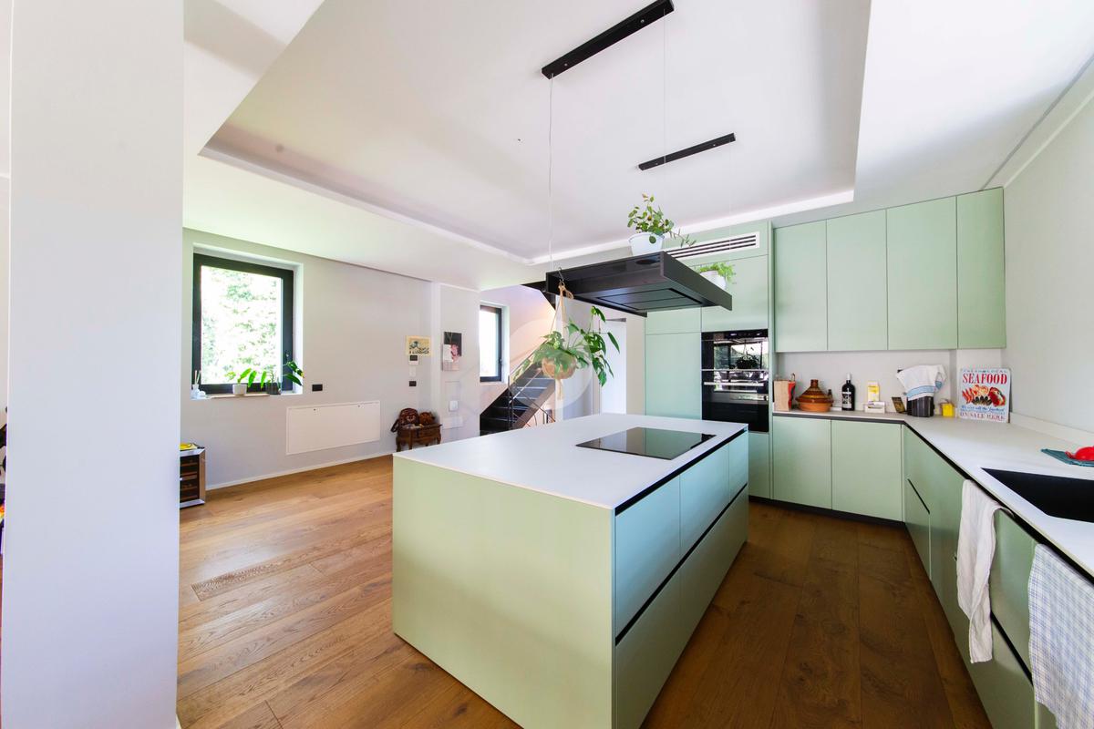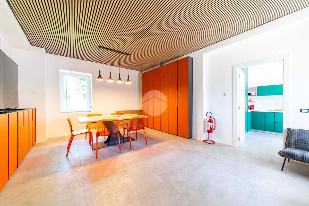 Al piano terra ci accoglie una zona multifunzionale pensata principalmente come ufficio, ideale per attività professionali, smart working o studio privato. L’ambiente è ampio, ben organizzato, con diverse postazioni di lavoro e tanta luce naturale. Accanto all’area operativa, troviamo un angolo cucina attrezzato e uno spazio ricreativo, perfetto per le pause pranzo o per momenti di relax durante la giornata lavorativa. A completare il piano, un bagno finestrato, comodo e ben rifinito, e uno splendido porticato coperto, affacciato sul verde, ideale per ricevere ospiti o semplicemente godersi l’esterno in ogni stagione. Salendo al primo piano, si apre l’ampia zona giorno, un ambiente moderno, raffinato e molto luminoso. Il soggiorno doppio si sviluppa in un open space elegante, con zona pranzo e living, mentre la cucina a isola con piano cottura a induzione è il cuore pulsante dello spazio, perfetta per chi ama cucinare e vivere la casa in modo conviviale. Anche qui troviamo un pratico antibagno e un bagno finestrato dal design moderno.