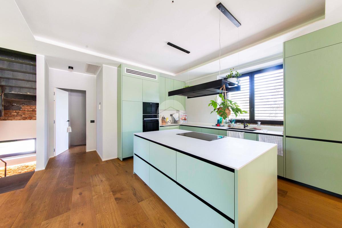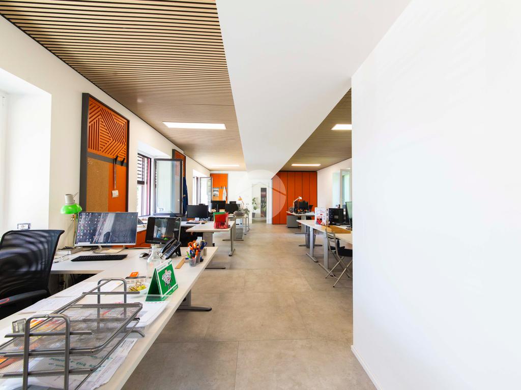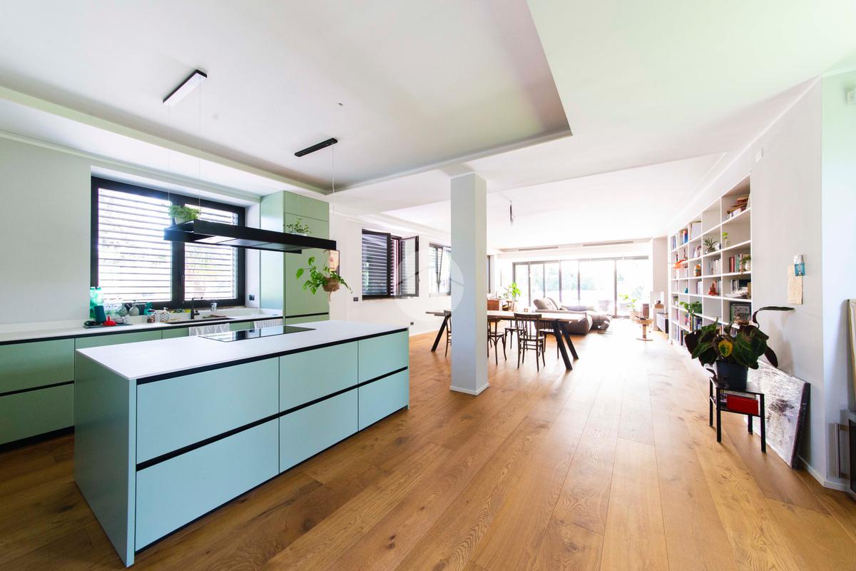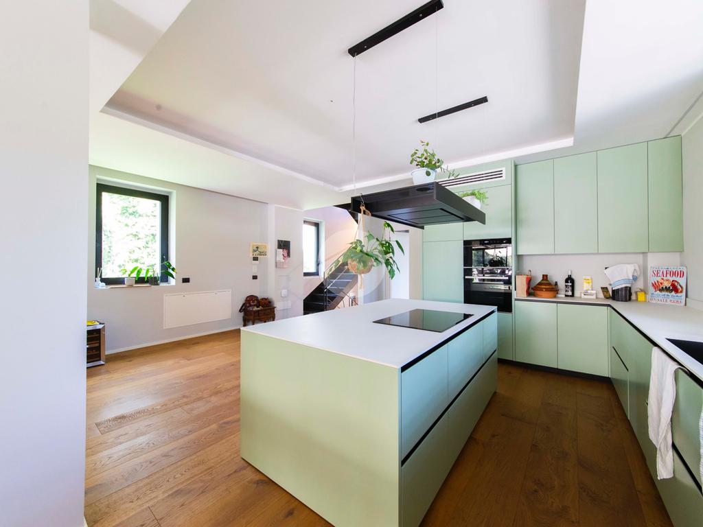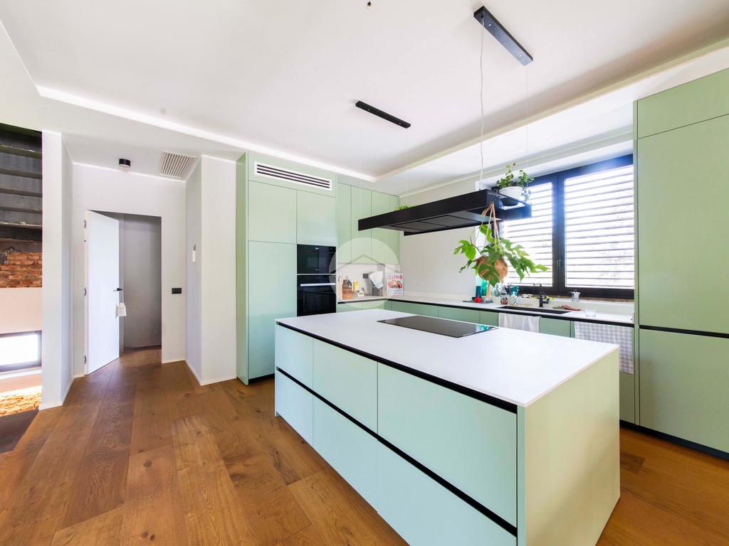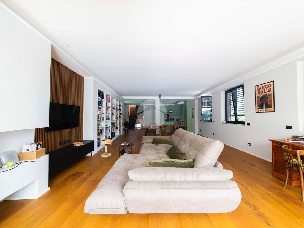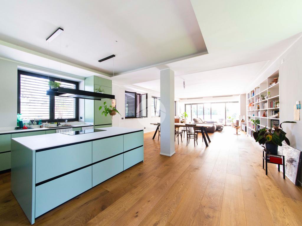 Al piano terra ci accoglie una zona multifunzionale pensata principalmente come ufficio, ideale per attività professionali, smart working o studio privato. L’ambiente è ampio, ben organizzato, con diverse postazioni di lavoro e tanta luce naturale. Accanto all’area operativa, troviamo un angolo cucina attrezzato e uno spazio ricreativo, perfetto per le pause pranzo o per momenti di relax durante la giornata lavorativa. A completare il piano, un bagno finestrato, comodo e ben rifinito, e uno splendido porticato coperto, affacciato sul verde, ideale per ricevere ospiti o semplicemente godersi l’esterno in ogni stagione. Salendo al primo piano, si apre l’ampia zona giorno, un ambiente moderno, raffinato e molto luminoso. Il soggiorno doppio si sviluppa in un open space elegante, con zona pranzo e living, mentre la cucina a isola con piano cottura a induzione è il cuore pulsante dello spazio, perfetta per chi ama cucinare e vivere la casa in modo conviviale. Anche qui troviamo un pratico antibagno e un bagno finestrato dal design moderno.