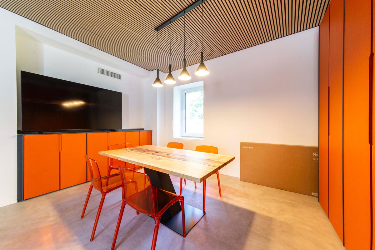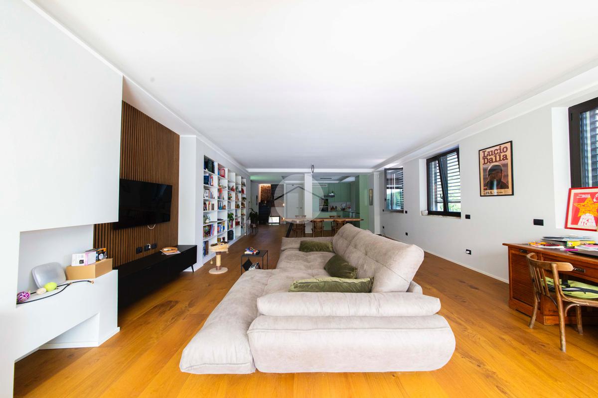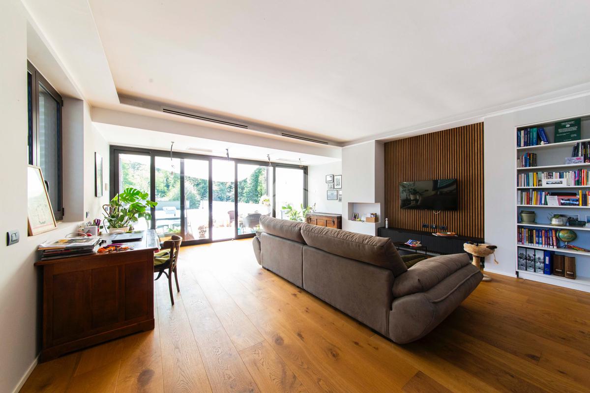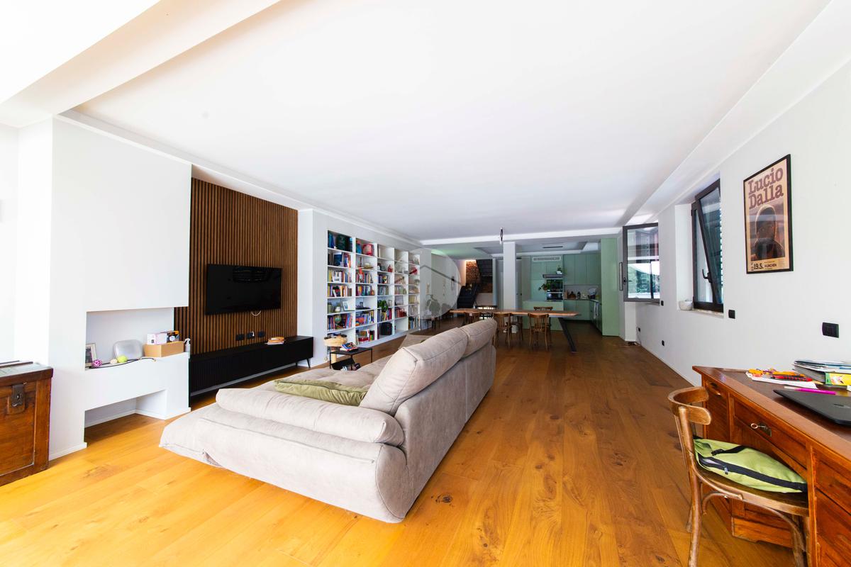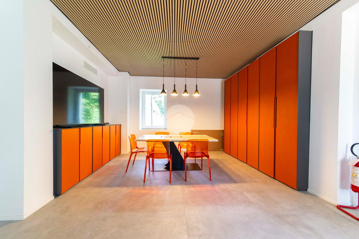 Dal soggiorno si accede a un terrazzo esterno, , che nasconde una particolarità molto comoda: tramite una scala esterna, è possibile raggiungere direttamente il giardino e il piano terra senza passare dagli uffici, garantendo così privacy e indipendenza tra gli spazi lavorativi e quelli abitativi.