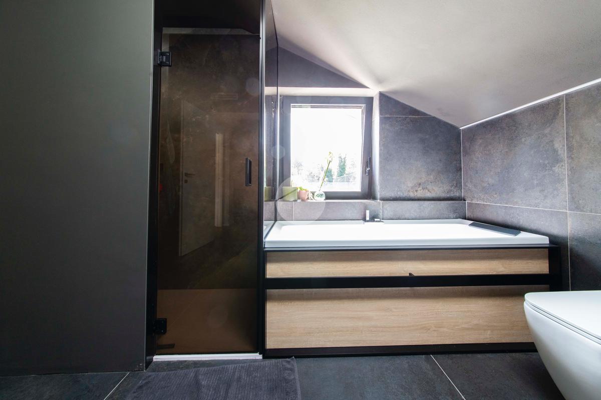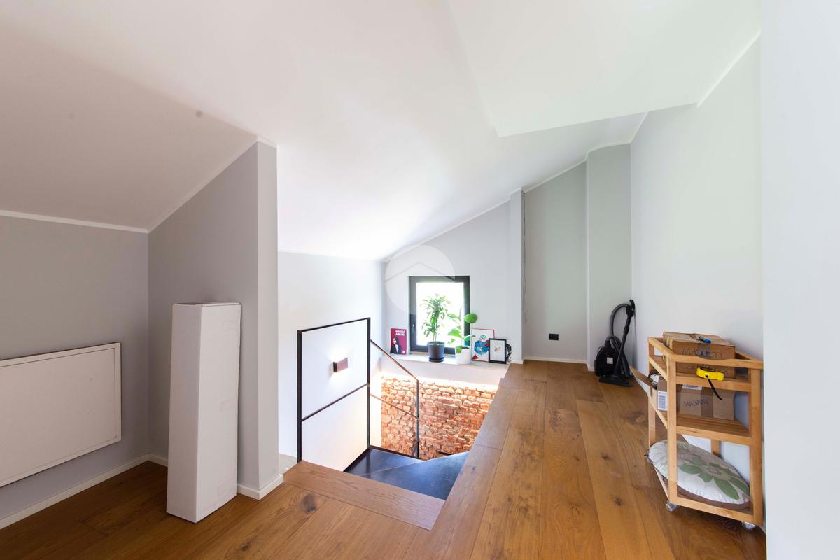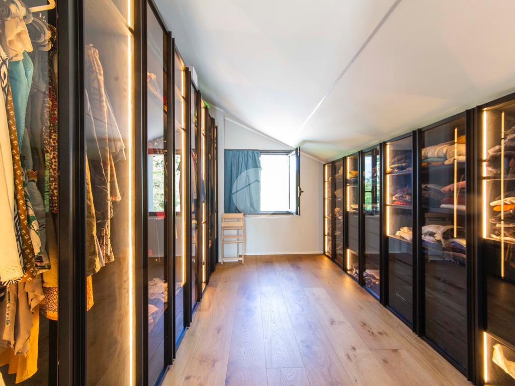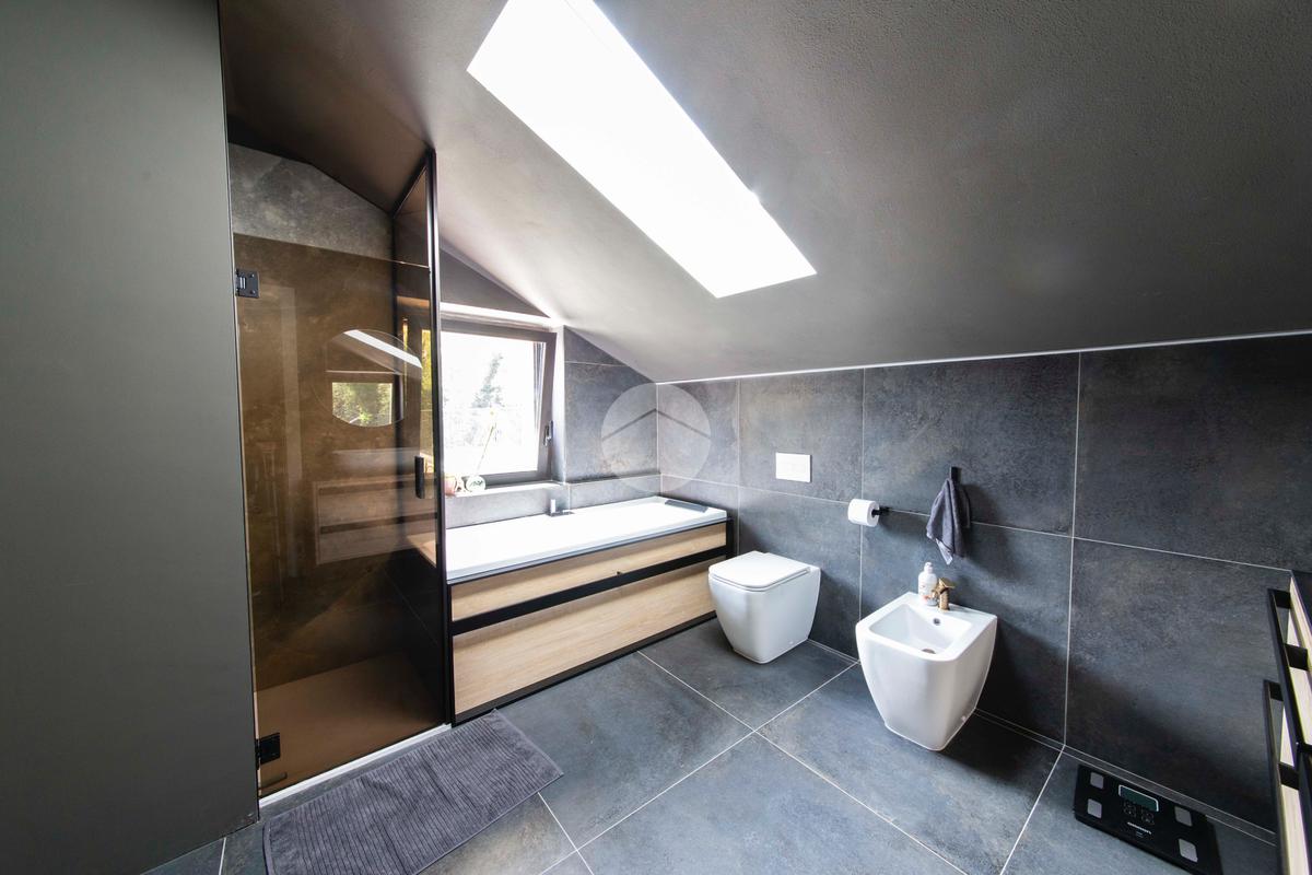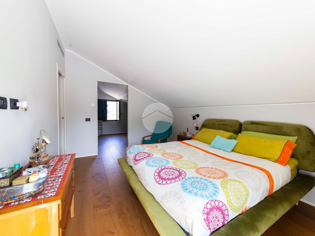 Al secondo e ultimo piano, mansardato, ci spostiamo nella zona notte. Qui troviamo una camera da letto matrimoniale, con travi a vista e accesso diretto a un secondo terrazzo privato. Completa il piano una cabina armadio su misura, realizzata in vetro con illuminazione LED integrata, e un bagno padronale molto spazioso, dotato sia di una vasca freestanding che di una doccia, in un ambiente elegante e rilassante.
