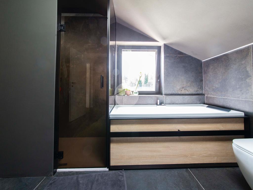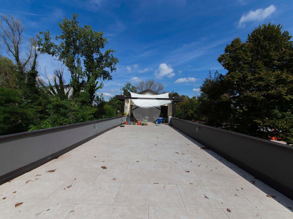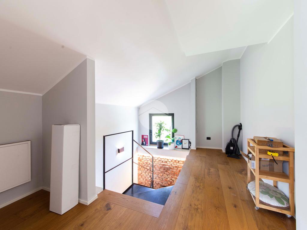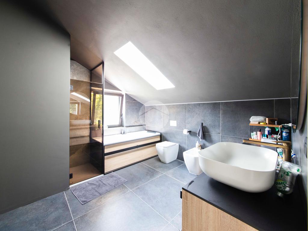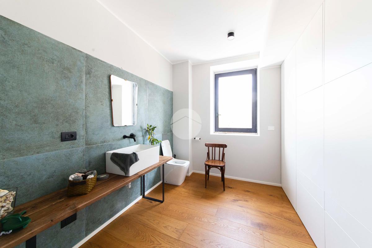 Al secondo e ultimo piano, mansardato, ci spostiamo nella zona notte. Qui troviamo una camera da letto matrimoniale, con travi a vista e accesso diretto a un secondo terrazzo privato. Completa il piano una cabina armadio su misura, realizzata in vetro con illuminazione LED integrata, e un bagno padronale molto spazioso, dotato sia di una vasca freestanding che di una doccia, in un ambiente elegante e rilassante.