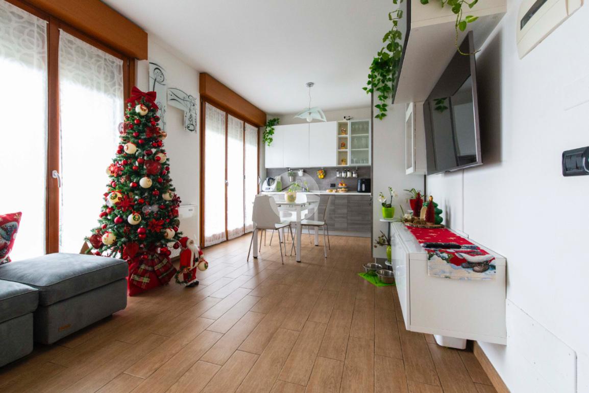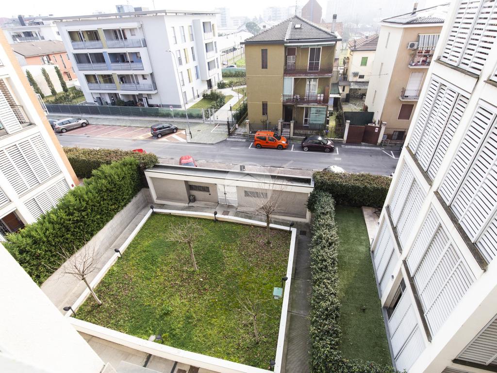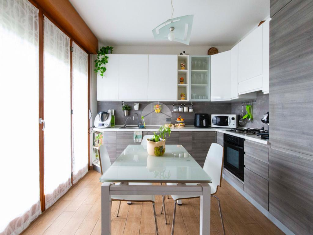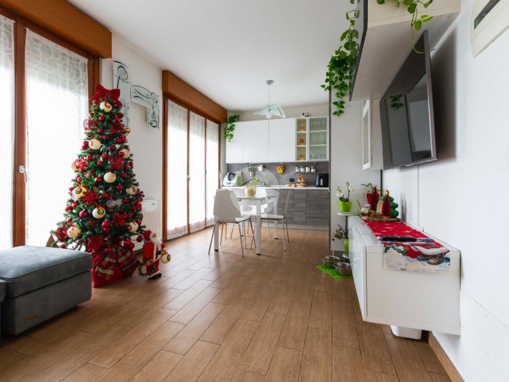 L’appartamento risulta essere così composto: ingresso diretto nella zona living con cucina a vista, doppiamente esposta e con portafinestra che permette l’accesso all’ampio terrazzo della casa, con piacevole affaccio su verde condominiale.
