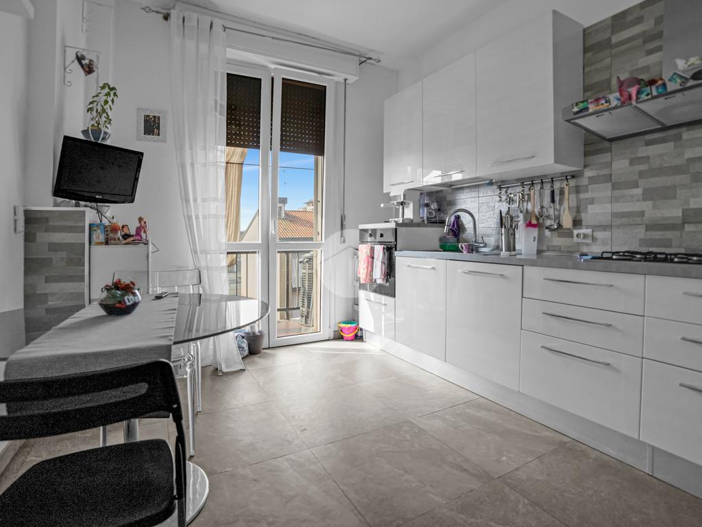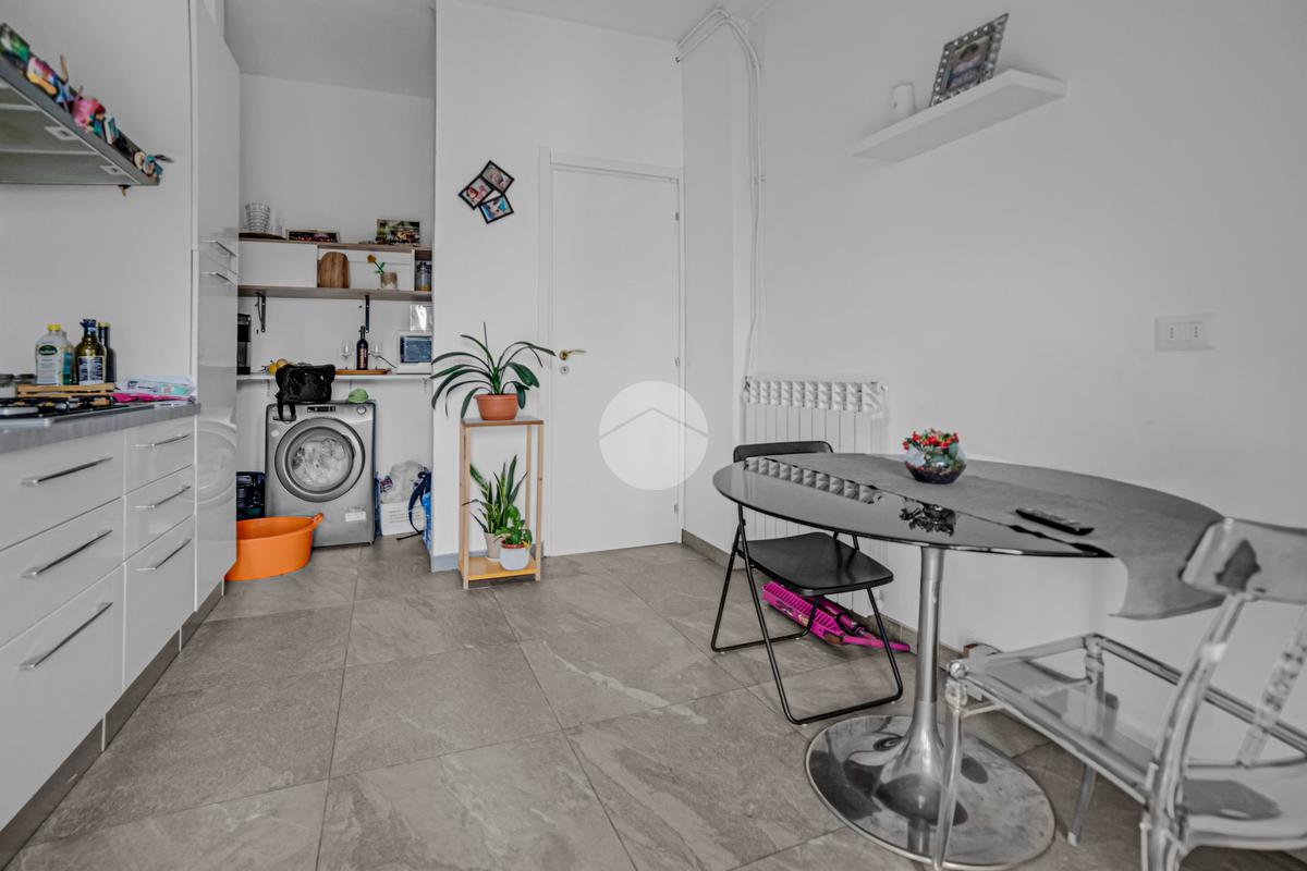Proseguendo per il corridoio si accede alla grande cucina abitabile, anch’essa dotata di balcone, con tranquillo affaccio sul cortile condominiale e angolo lavanderia.
