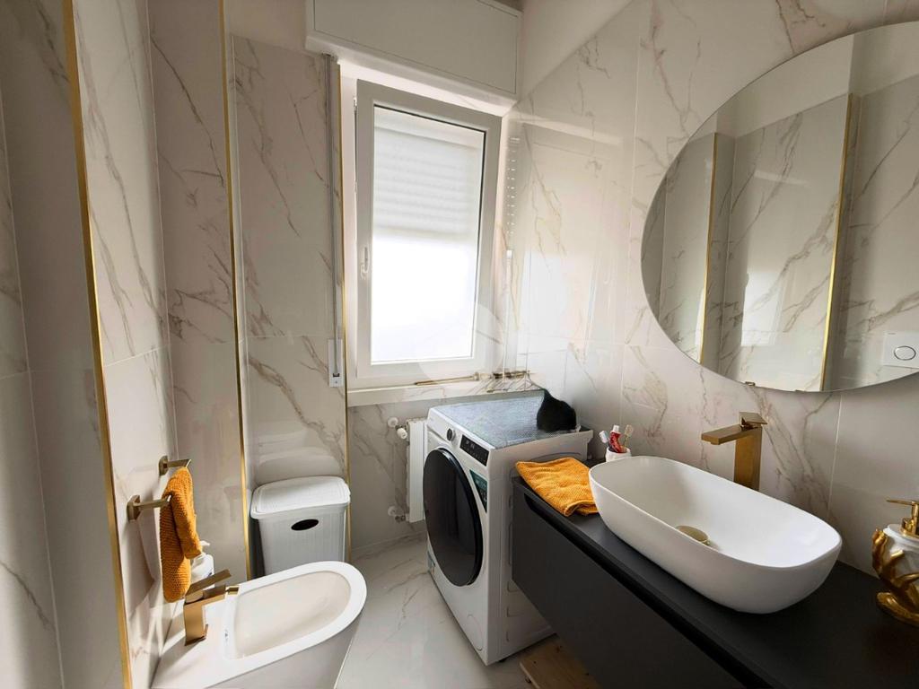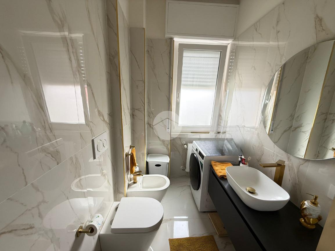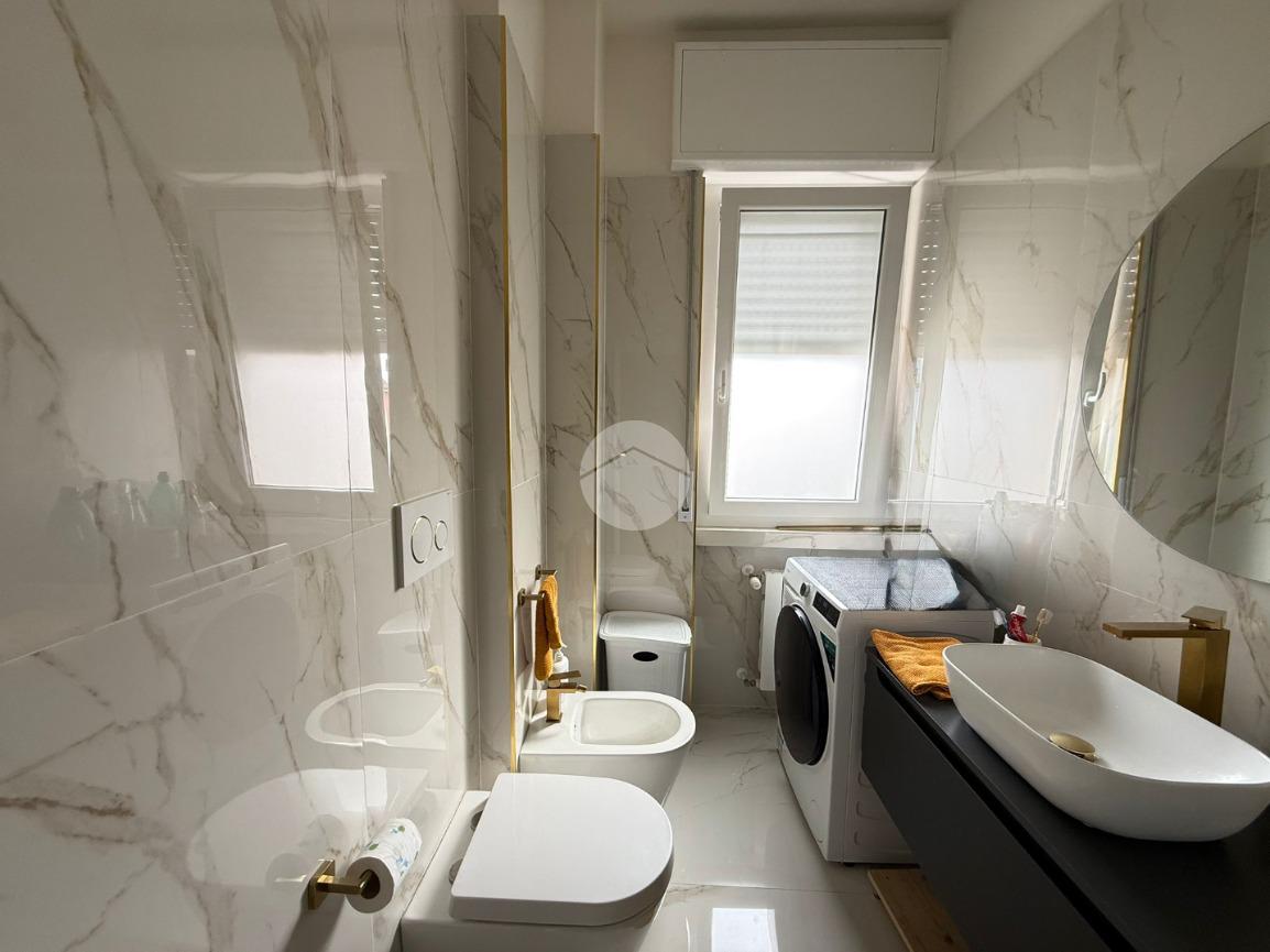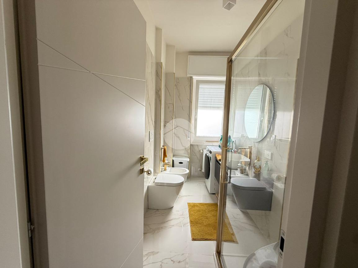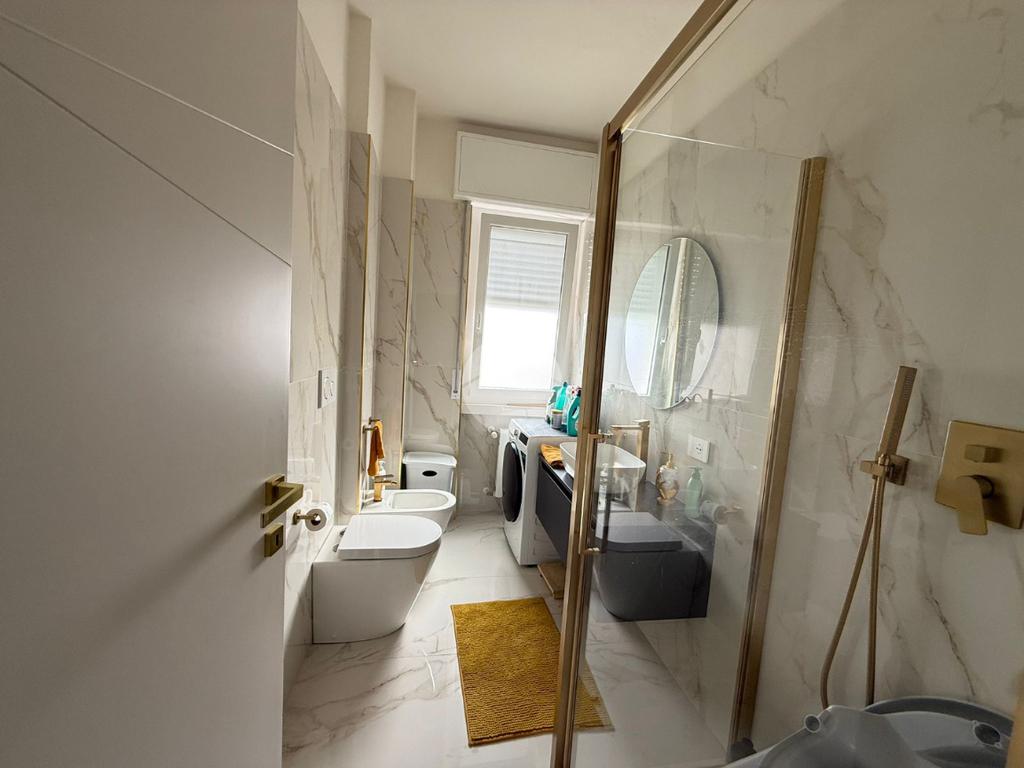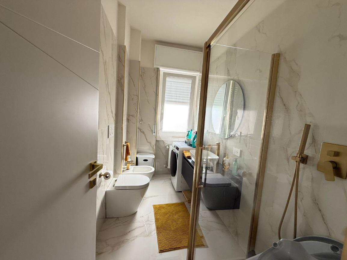 Conclude l’unità Il bagno finestrato con box doccia, gli spazi sono stati studiati per ospitare comodamente anche la zona lavanderia.